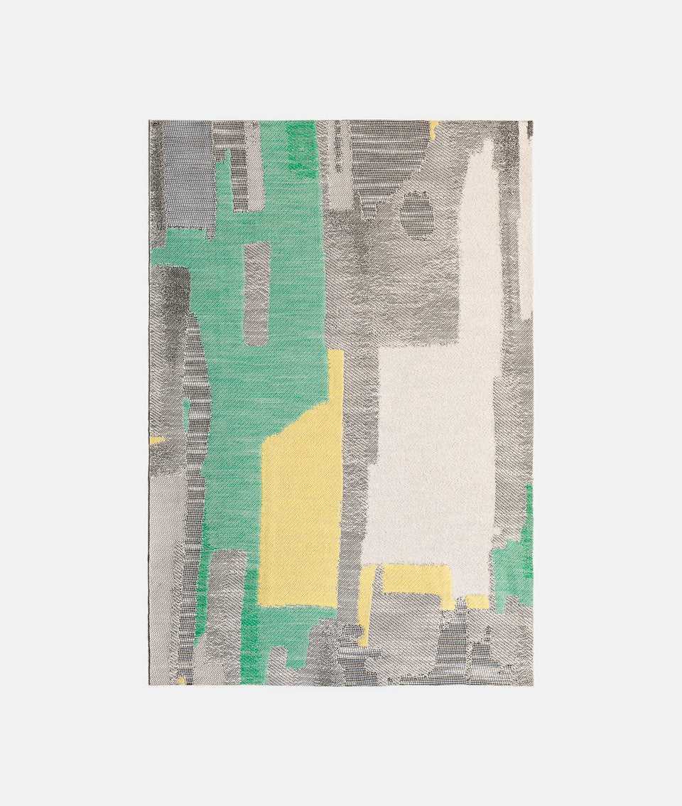 Tessuto jacquard in filati misti, caratterizzato da una texture composita che alterna bouclette, filati fiammati e rafia in una ricca espressione di matericità. Il motivo richiama una città immaginaria di pietra astratta, evocando pennellate su tela attraverso una costruzione meticolosamente studiata nelle strutture e nella scelta dei filati.