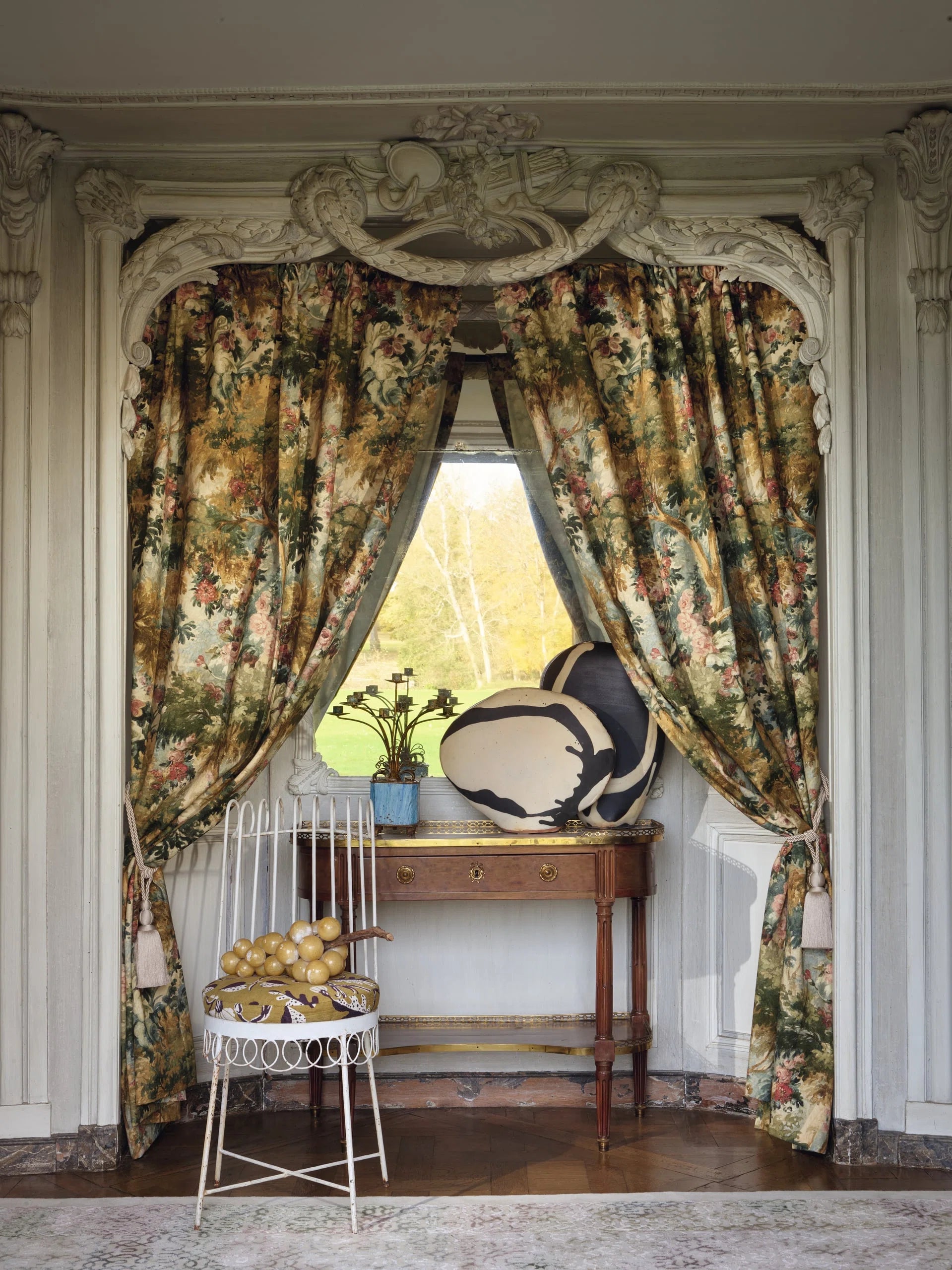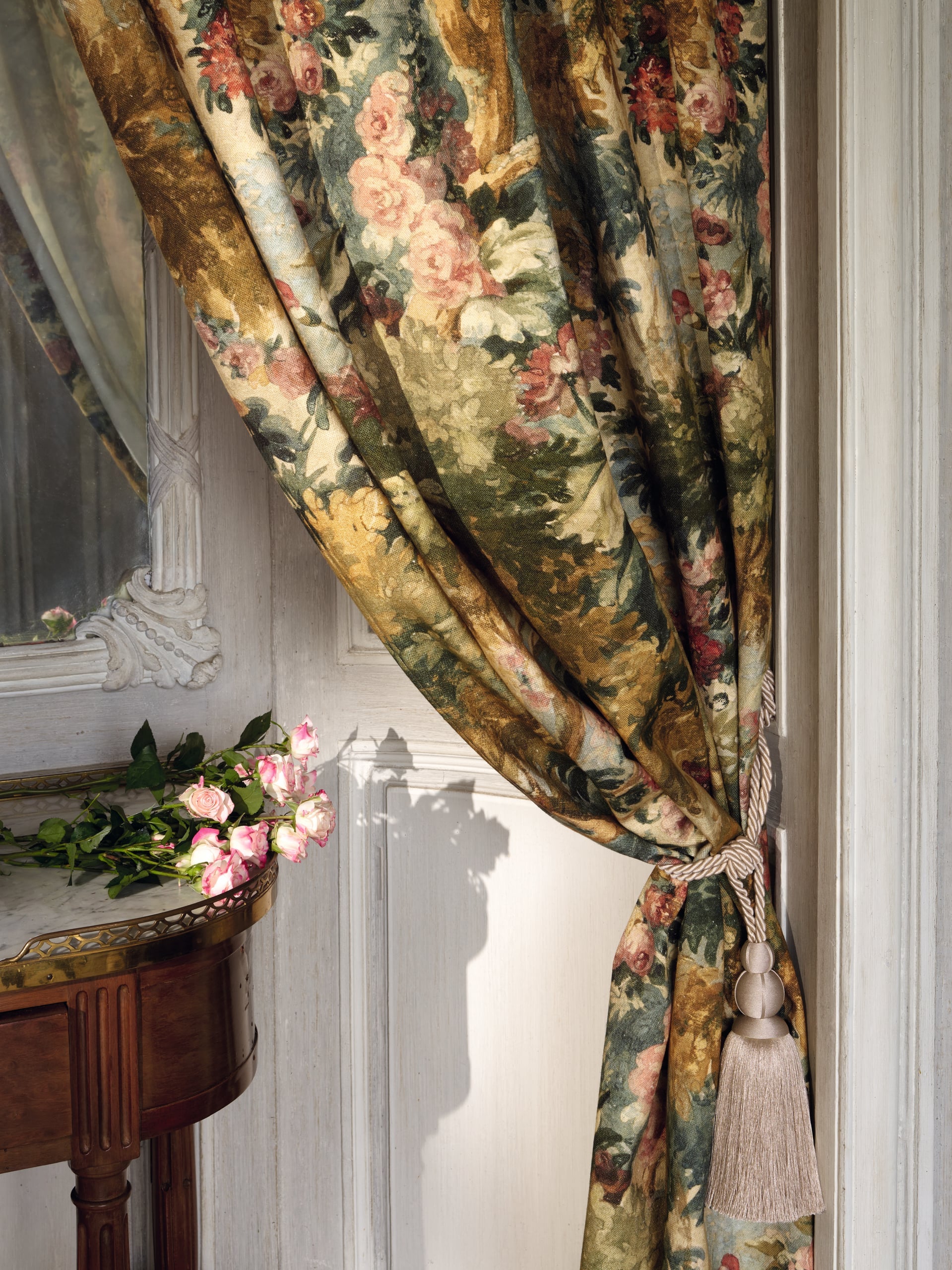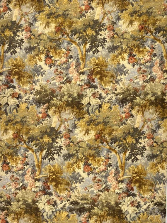 Tessuto Pierre Frey in cotone adatto a tende. Un magico disegno ispirato a una gouache del XIX secolo degli archivi Pierre Frey, che racconta una foresta incantata con querce, boschetti e rose in fiore che si mescolano in un paesaggio da sogno.