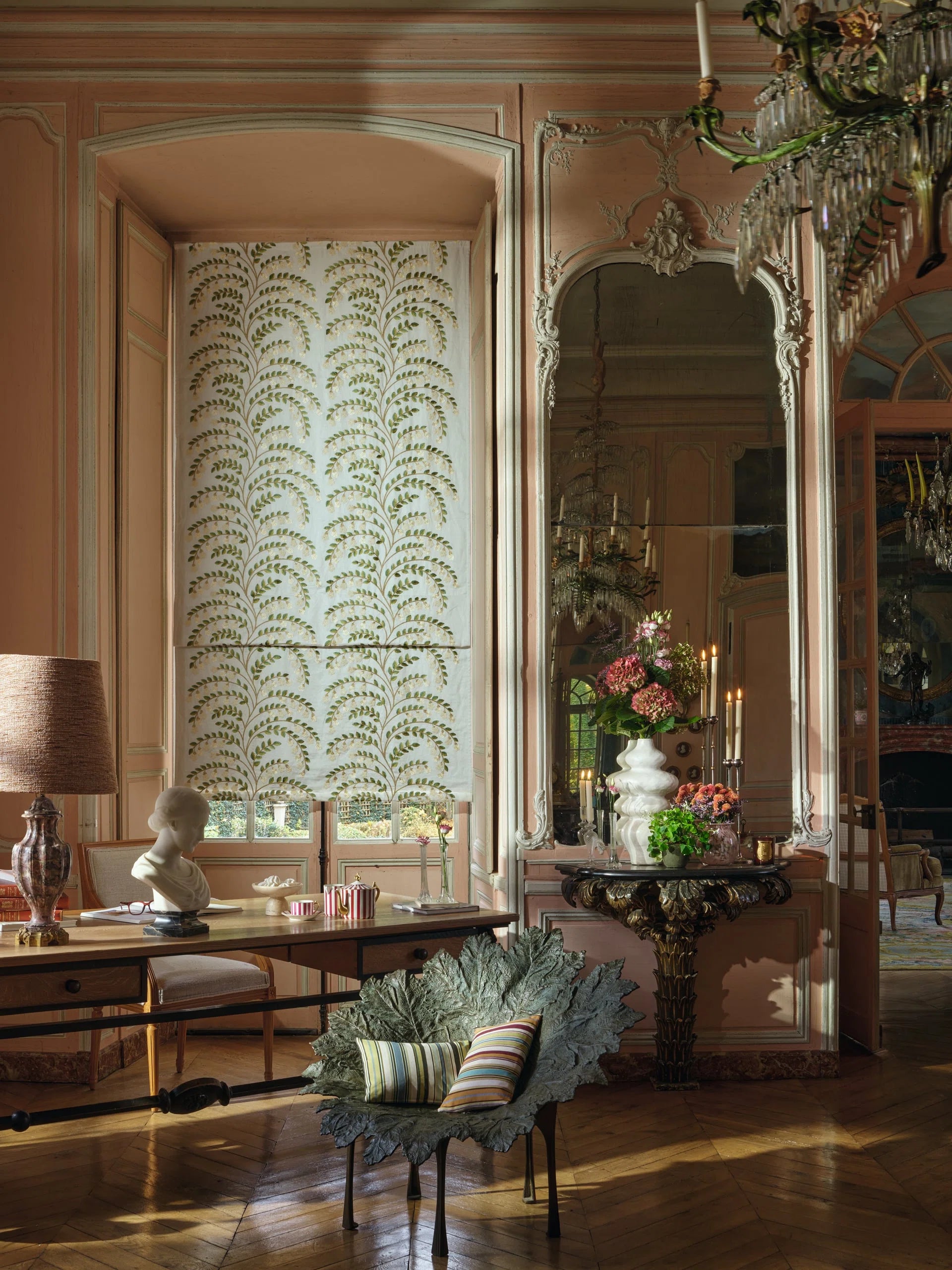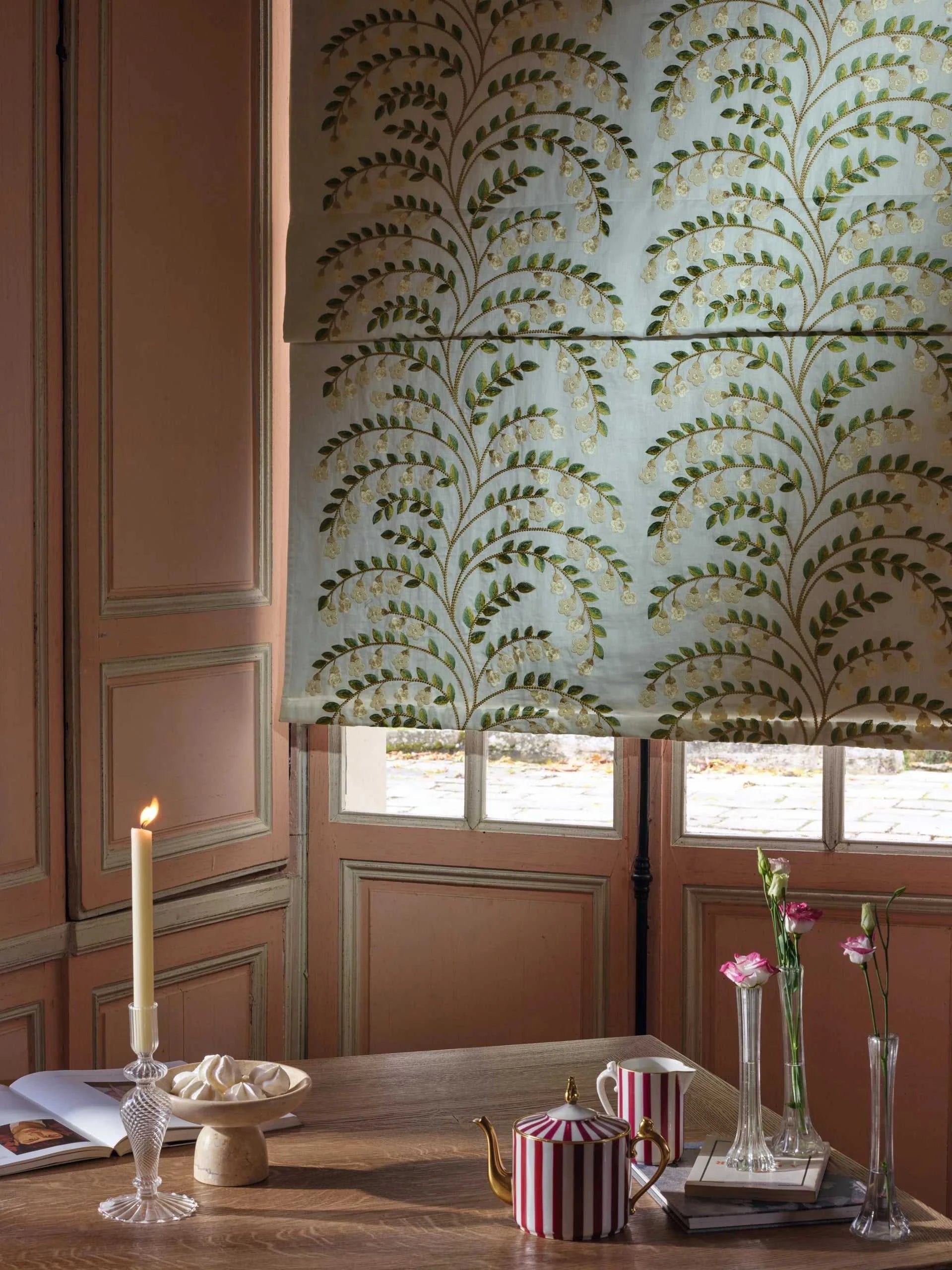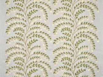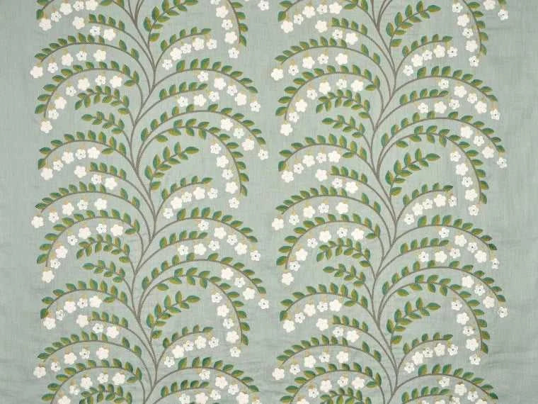Tessuto Pierre Frey in lino, impreziosito da un ricamo elegante che raffigura rami di gelsomino in fiore. I colori delicati, i ricami curati nei dettagli e le applicazioni in feltro gli danno un fascino ricercato e senza tempo.