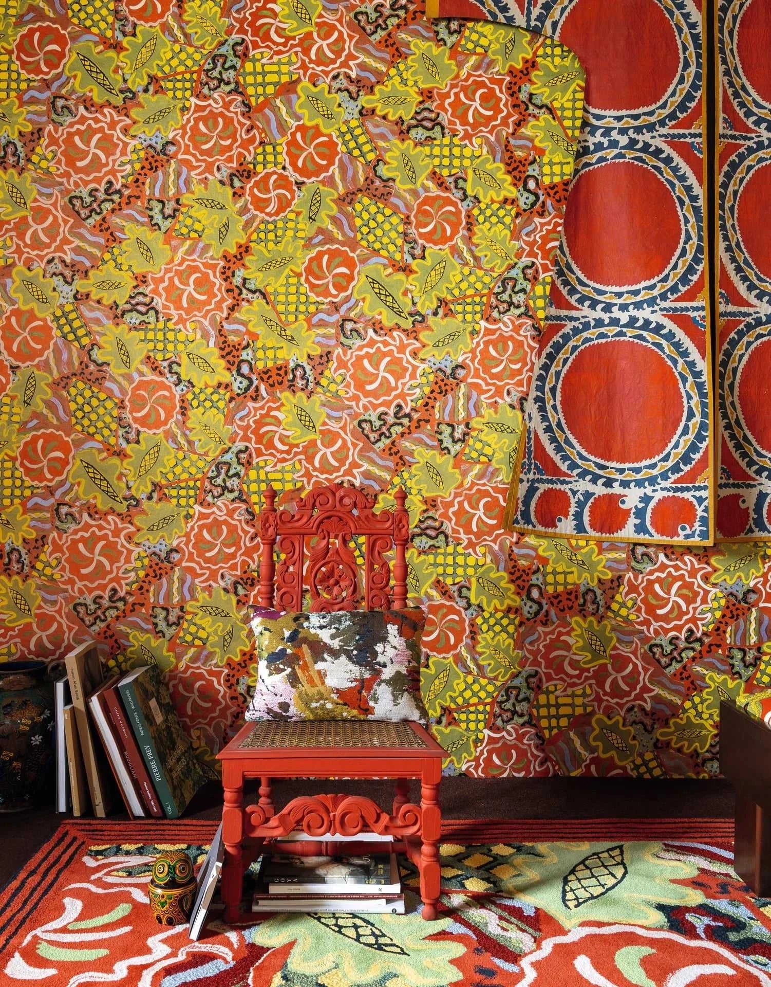 Carta da parati in TNT ispirata ai collage di Isabelle de Borchgrave, con elementi disposti con spirito giocoso e colori vivaci. La combinazione di motivi, texture e dettagli crea un effetto tridimensionale sorprendente, donando alla parete un carattere unico e raffinato.
